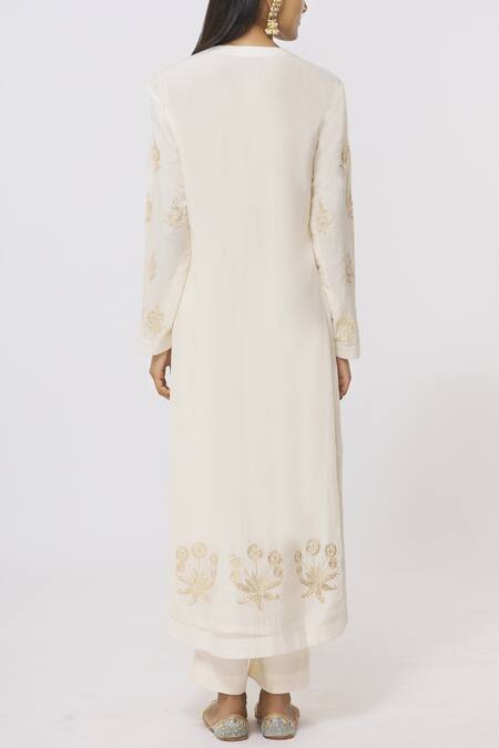 Off white kurta with floral embroidered all over. Paired with pants & dupatta.