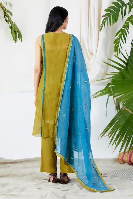 Swamp green kurta with floral embroidery placement and lace trim. Comes with straight fit pant and blue dupatta.