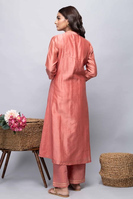 Buy_Kalakaari By Sagarika_Peach Cotton, Chanderi Silk Plain V Neck Kurta And Pant Set _at_Aza_Fashions