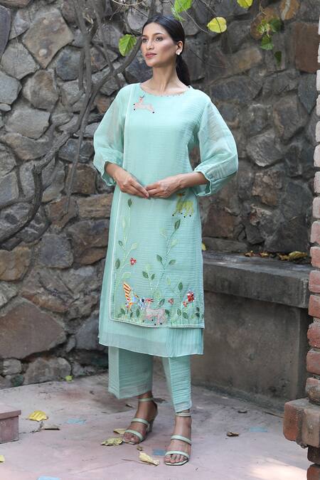 Mint handwoven chanderi kurta featuring patchwork and resham embroidered motifs. Paired with coordinating pant and designed with a round neckline and three-quarter sleeves.