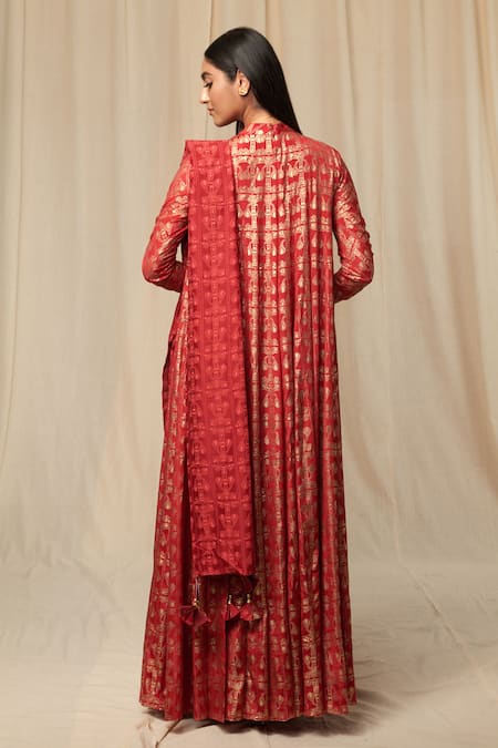 Red Anarkali Chiffon Dupatta Chanderi Printed High Kurta Set