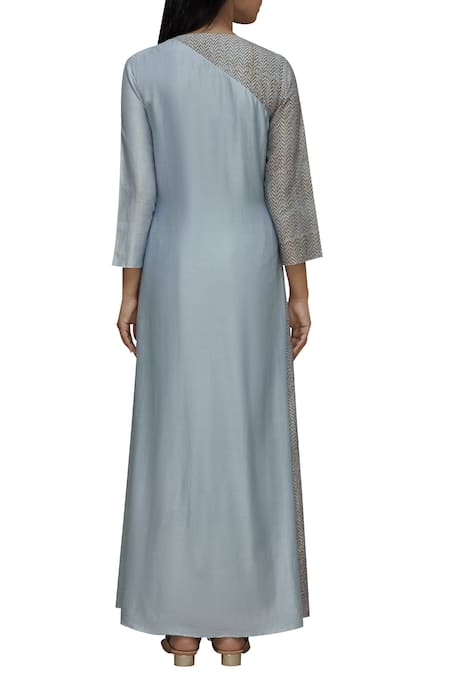 Light blue handloom chanderi angrakha with block print & placement embellishment. Paired with kota cotton pants.