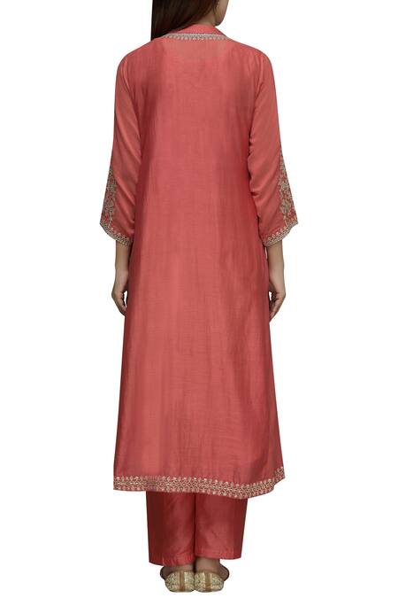 Coral Red kurta with placement work. Comes with pants and dupatta.
