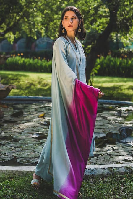 Powder blue kurta with gota work detail. Paired with pant & dupatta.