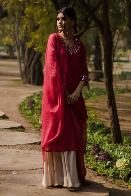 Red kurta with mirror work embroidered detail. Paired with gharara & dupatta.