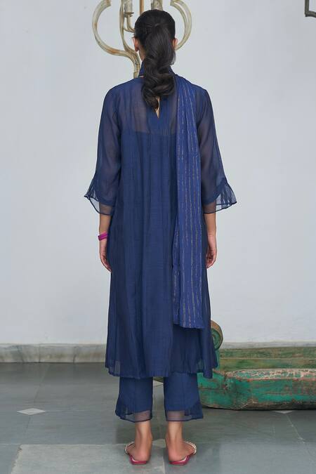 Blue Kurta Chanderi Pant And Inner Slip Cotton Round Set
