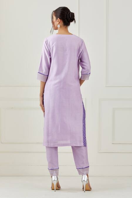 Lavender chanderi V neck kurta with sequin embroidered motifs. Paired with pant & dupatta.