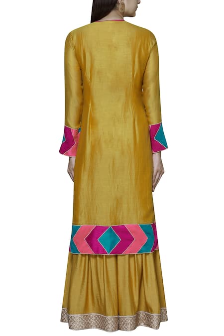 Mustard kurta with embellished detail & geometric patchwork. Comes with pleated sharara and dupatta.
