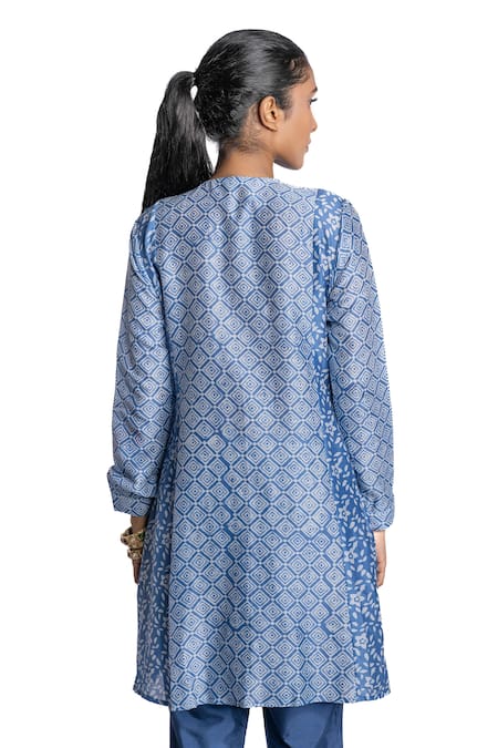 Blue Kurta Chanderi And Pant Viscose Cotton Block Print & Thread Tunic & Set
