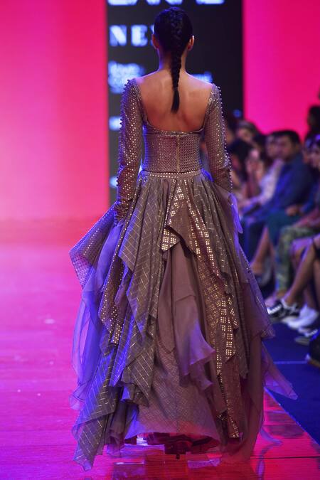 Grey Chanderi Wide Neck Layered Lehenga Set