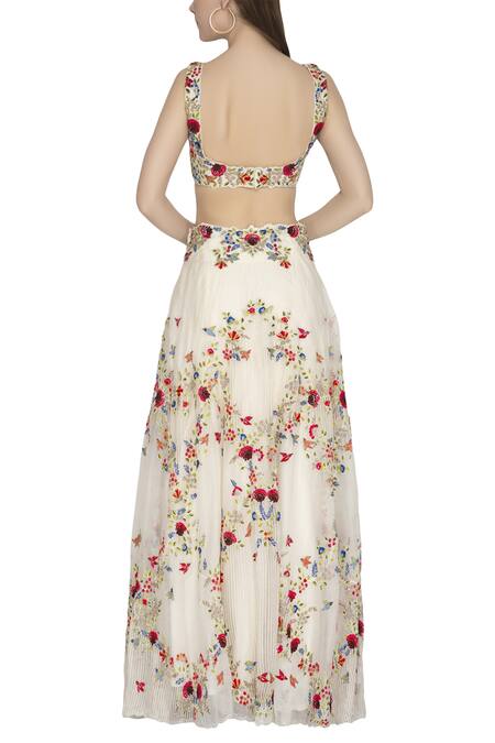 Ivory lehenga with floral embroidered motifs & zari work. Comes with matching blouse & sheer dupatta.