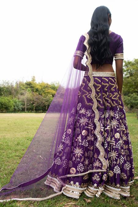 Purple lehenga with embroidered tree motifs all-over and patchwork. Comes with blouse and net dupatta.