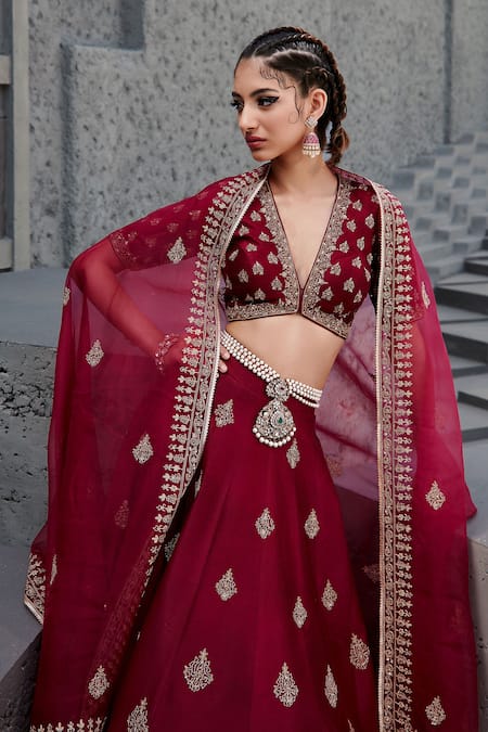 Buy_Jigar Mali_Red Organza, Chanderi Dori, Floral, Sequin V Neck Lehenga Set _Online_at_Aza_Fashions