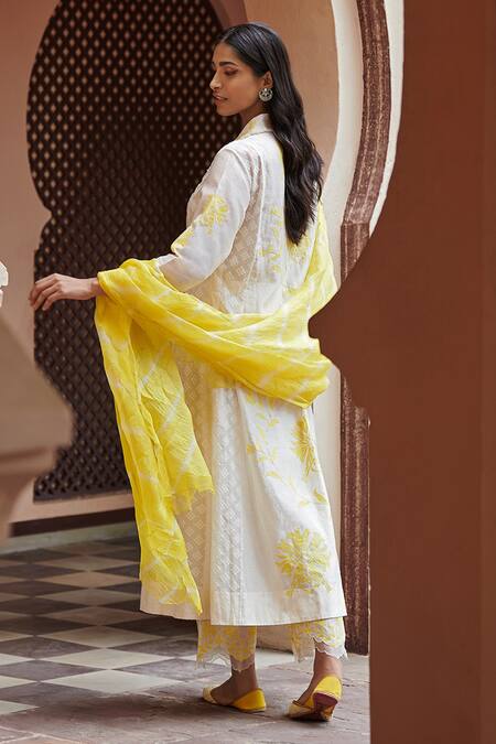 Ivory panelled kurta with floral hand cut applique, gathers at the neckline, fringe detail & straight silhouette. Comes with cotton organza pant & yellow kota silk dupatta.