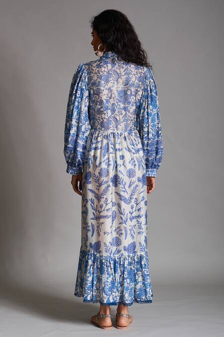 Off white tiered maxi dress with floral printed motifs, lace detail, front button placket, frill hem & puff sleeves.