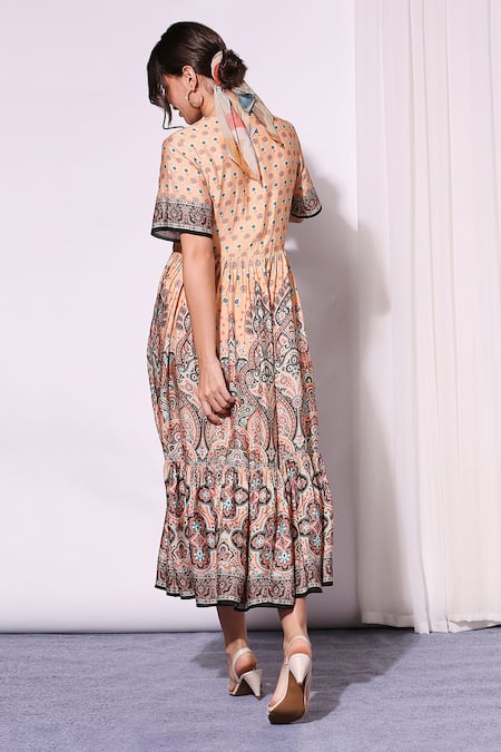 Buy_Soup By Sougat Paul_Beige Chanderi Round Printed Dress _Online_at_Aza_Fashions
