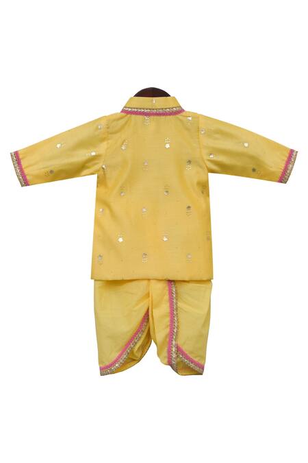 Yellow overlap kurta featuring placement foil print and welt pocket. Paired with cotton dhoti pant embellished with placement lace work.