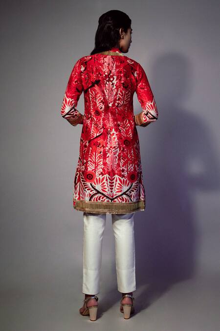 Red kurta with all-over floral print, hand embroidery on the neckline-cuffs & straight silhouette. Comes with ivory pant.
