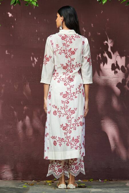White Kurta Chanderi Pant Cotton Embroidery V Neck Printed Set
