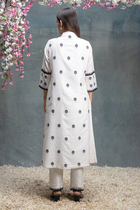 Ivory kurta featuring hand block print with black floral motifs and cutdana embroidery on the placket and cuffs. Paired with straight-fit pants with embroidered hems.