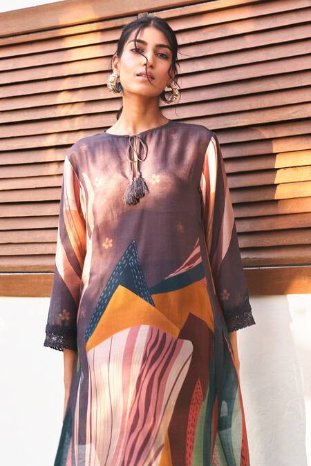 Charcoal grey kurta in an abstract print with keyhole neckline and tonal lace detail along the hemlines. Comes with tonal chanderi trouser.