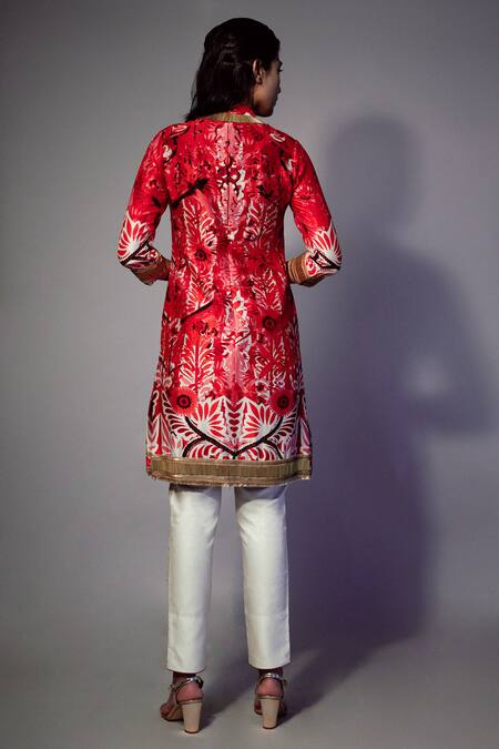 Shop_Saksham & Neharicka_Red Chanderi Floral, Sequin Round Printed Kurta _Online_at_Aza_Fashions