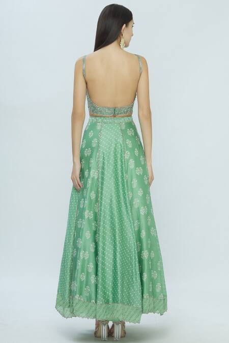 Green blouse with all over floral jaal embellishment. Comes with bandhani & floral motif printed lehenga & dupatta.