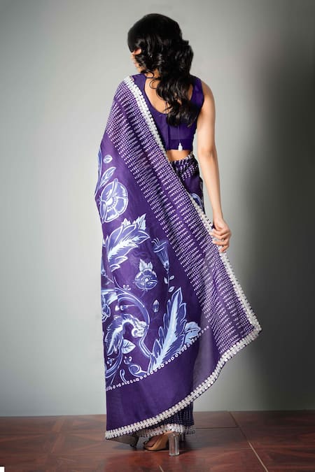 Ink blue saree with all-over digital floral print and hand embroidered blouse. Comes with unstitched blouse fabric.