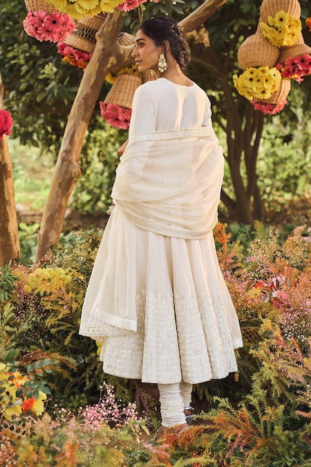 Ivory anarkali in chanderi silk base fabric with resham, patra & leather patch work. Paired with a churidar and organza silk border embroidered dupatta.