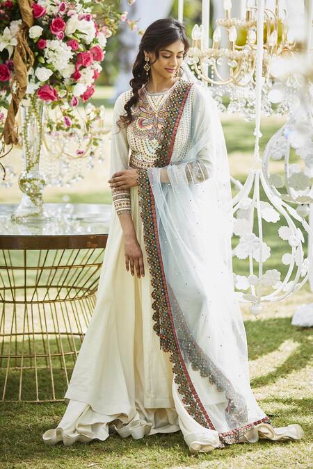 Buy_Varun Bahl_White Floral Round Chanderi Silk Anarkali Set_at_Aza_Fashions