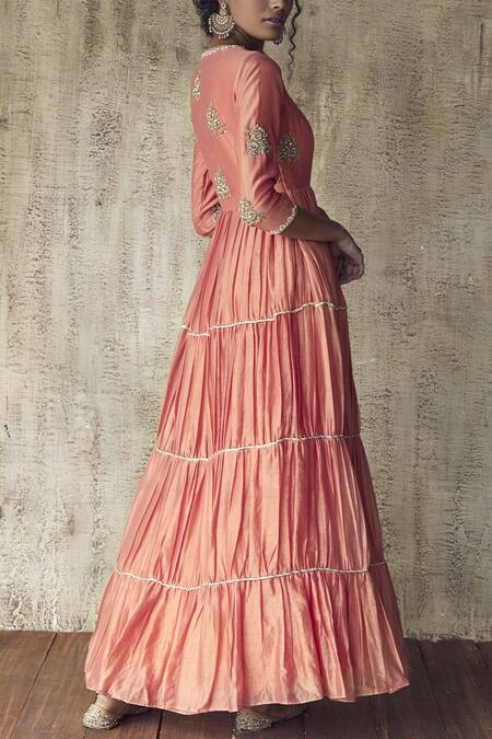 Coral orange anarkali with placement floral motif work. Comes with beige dupatta.