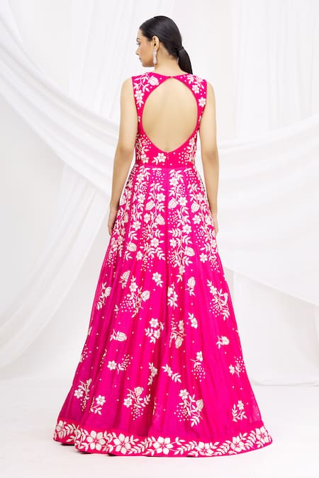 Pink anarkali with floral embroidered motifs. Paired with dupatta.