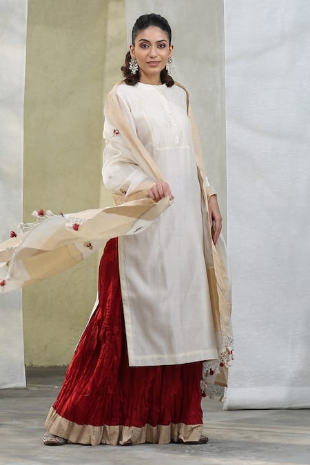 White chanderi silk dupatta with zardozi work, gold & tassel border.