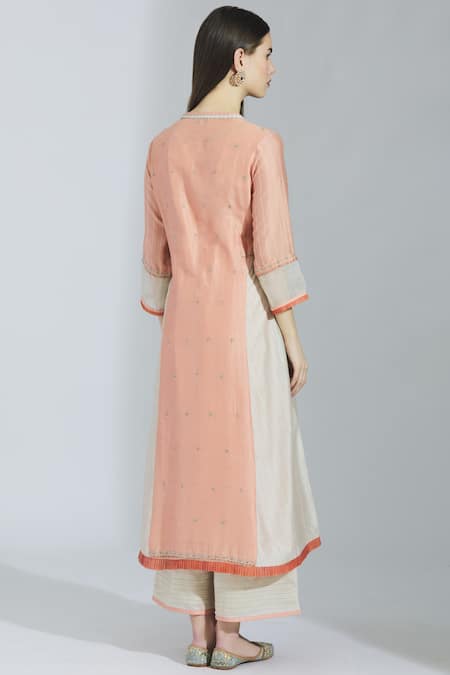 Buy_Poonam Dubey_Peach Chanderi Silk V Neck Kurta Palazzo Set _Online_at_Aza_Fashions