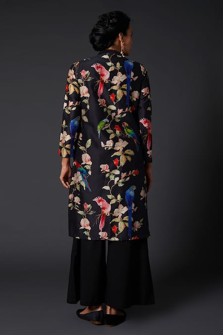 Black kurta with floral, bird printed motifs & mandarin collar. Paired with palazzo.