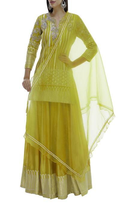 Yellow straight kurta with all-over floral & geometric motif embroidery. Comes with matching gharara & dupatta.