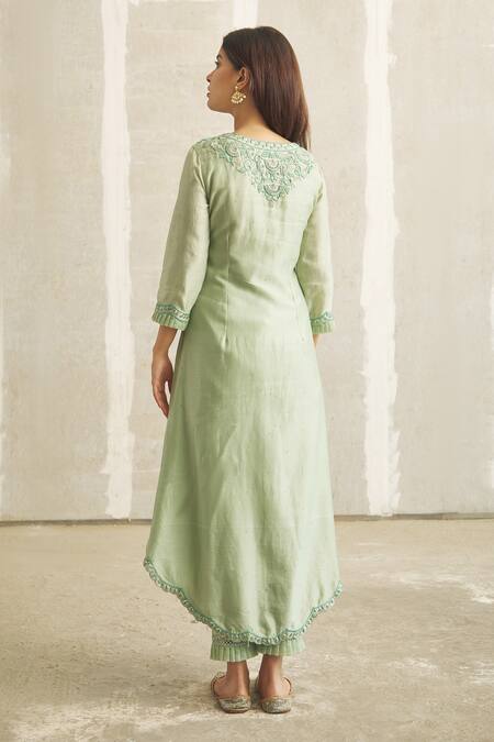 Moss green long kurta with asymmetric hem, featuring thread work and embellished with glass pipes and sequins. Comes with pleated hem panelled pants and an organza dupatta.