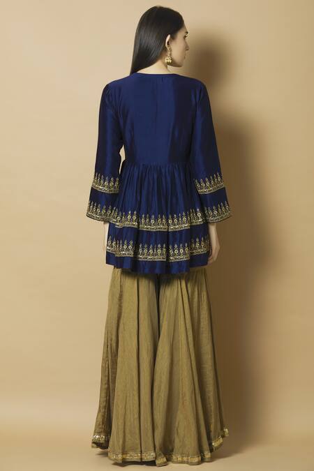 Blue peplum-style kurta with floral embroidery. Comes with contrast sharara pants & dupatta.
