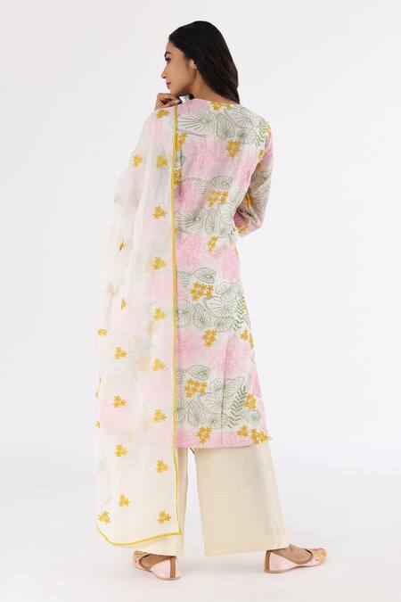 White chanderi silk kurta featuring closed round neck and all-over lotus pattern thread embroidery. Paired with a pyjama and organza dupatta with contrast floral butti pattern embroidery.