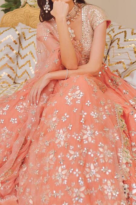Peach chanderi silk lehenga with mirror, leather embellished in floral motifs. Paired with embellished blouse & organza cutwork dupatta.
