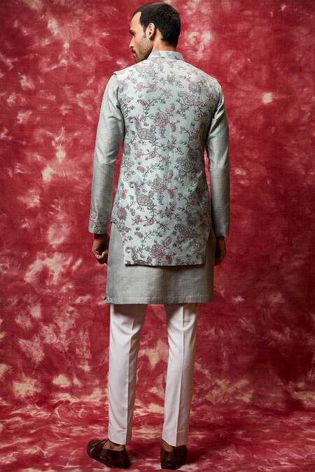 Powder blue Nehru jacket with all over floral bel embroidery. Comes with grey kurta & pants.