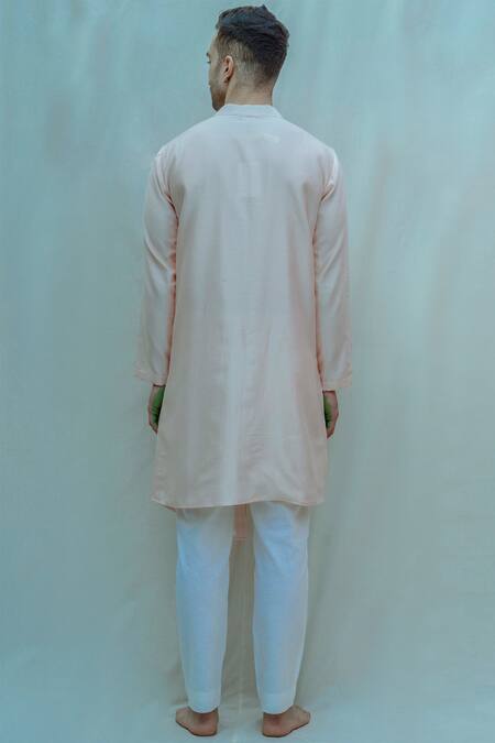 Peach straight kurta with front overlap & asymmetrical hem. Comes with matching straight pants.