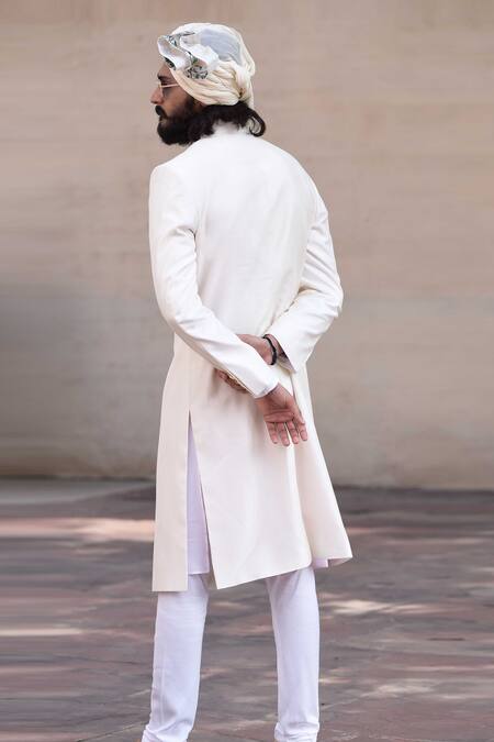 Ivory sherwani with patch pocket & front button placket. Paired with churidar, Banarasi bordered stole & safa.