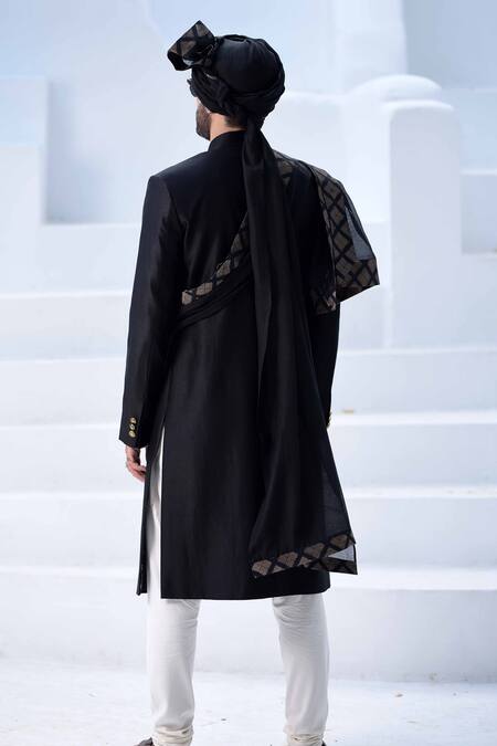 Black sherwani with patch pocket & front button placket. Paired with churidar, Banarasi geometric motif bordered stole & safa.