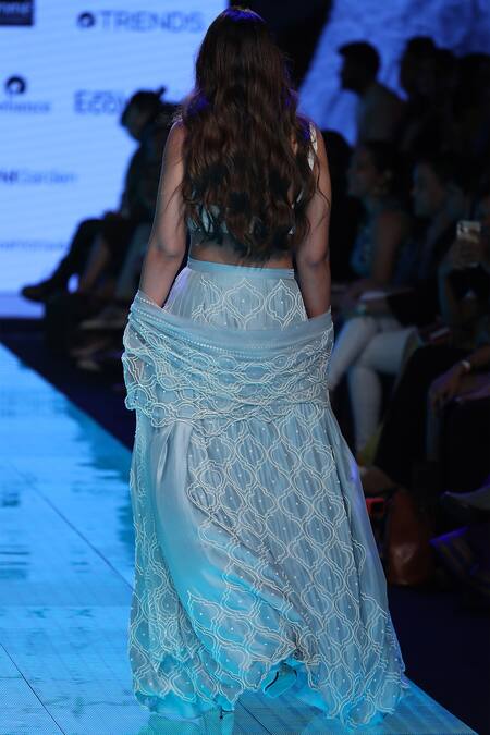 Blue maxi skirt with knife pleats, thigh-high slit & all-over Mughal motif bead work. Comes with cutwork border dupatta & embellished ivory crop top.