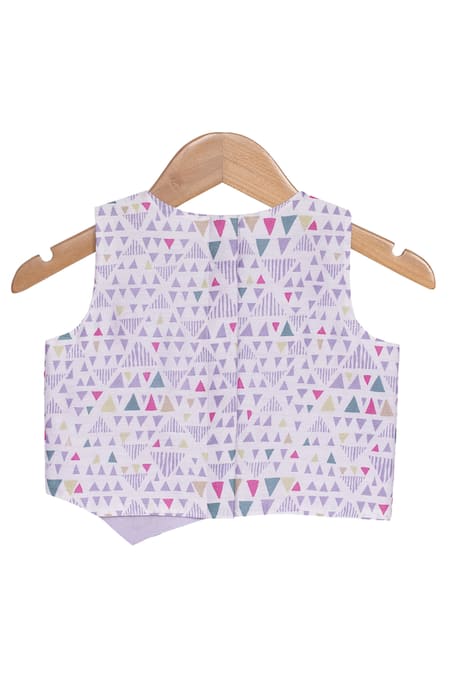 Lavender all-over geometric motif printed top. Comes with matching pom pom balls inserted balloon skirt.