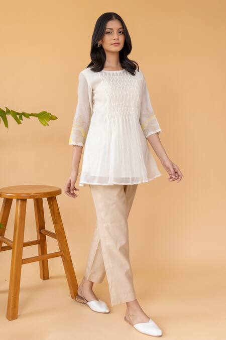 Off-white chanderi tunic with smocked pattern on bodice & yellow floral embroidered sleeves.