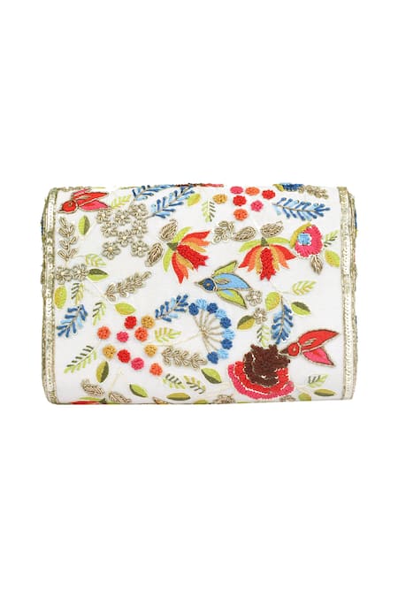 White embroidered flap clutch featuring multi-color floral motif thread work and bead danglings
