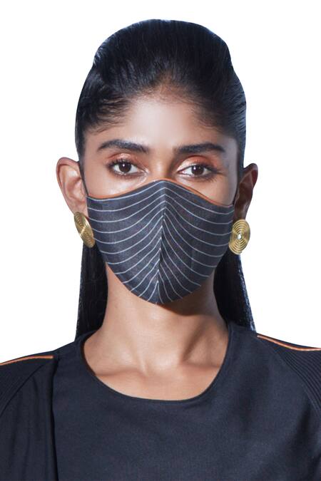 Dark grey face mask with all-over striped pattern print, elastic bands, tan piping detail & tube locks.