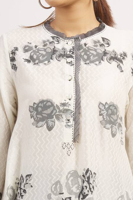 Off white chanderi tunic with front buttons, zig zag & floral block print & striped placket.